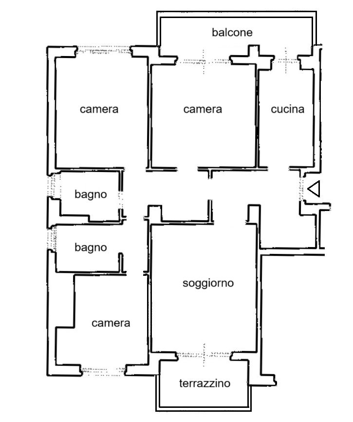 Ampio appartamento di quattro locali circondato da verde, così composto: ingresso su disimpegno, soggiorno, cucina abitabile, tre camere da letto, due bagni finestrati, terrazzino e balconata. Completano la proprietà due grandi locali cantina e solaio ed un box auto sotto casa. Servizio di portineria. Scuole per tutti i gradi a due passi.